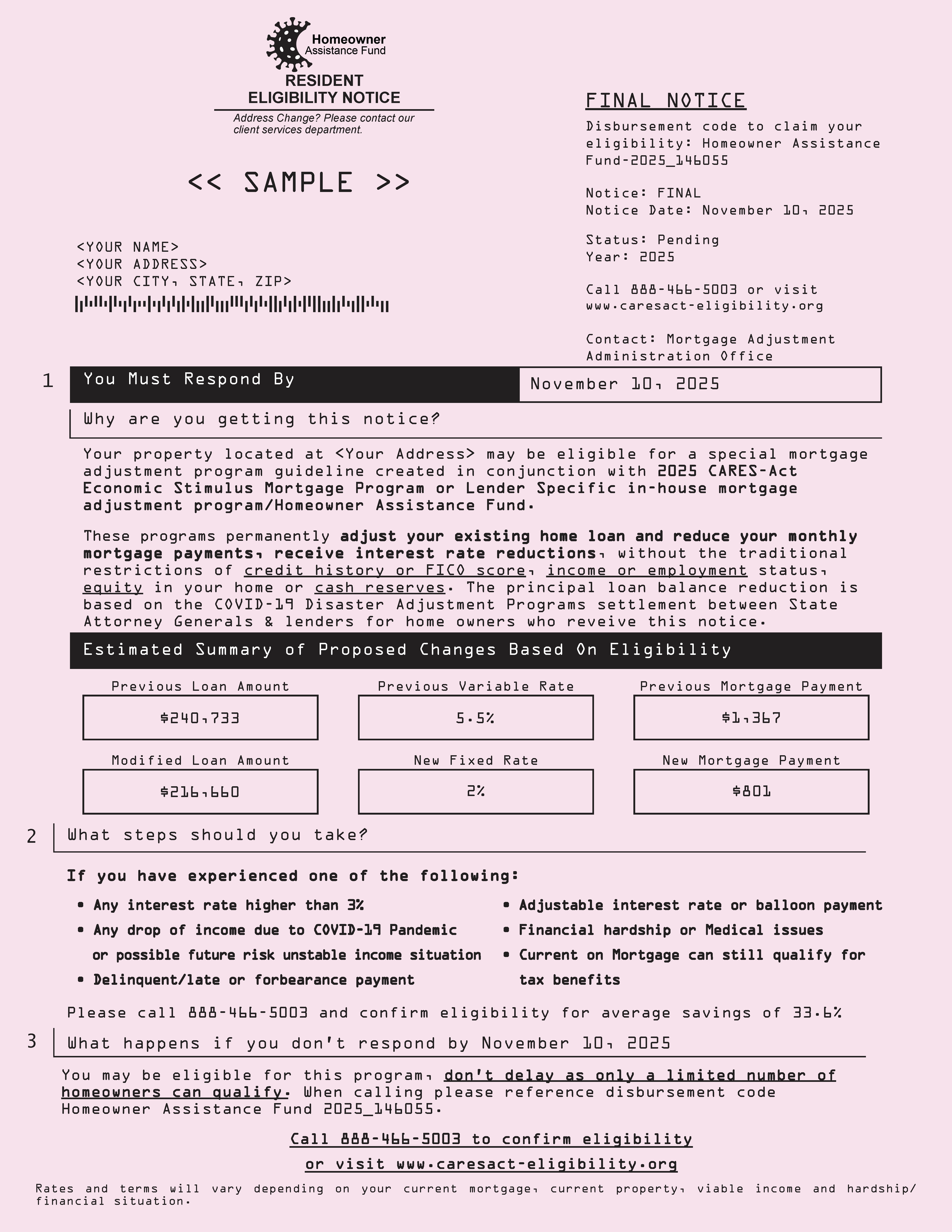 Your property located at <ADDRESS> is eligible for a one time mortgage correction program created in conjunction with the Cares Act Relief Program.